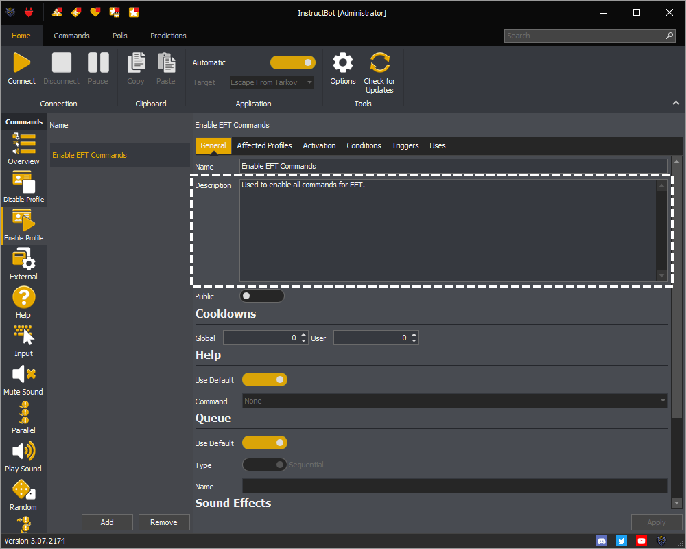 See: Name, Description, Public, Cooldowns ( Global or User ), Help ( Use Default or Command ), Queue ( Use Default, Type or Name ), Sound Effects ( Start or End ) or Text ( Start or End )