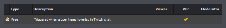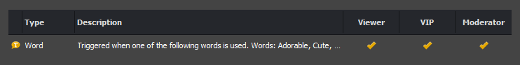 See: Overview, Identifier, Alias, Editing Triggers ( Overview, Adding a Trigger, Editing a Trigger or Removing a Trigger ), Types of Triggers ( Ban, Bits, Donations, Follow, Free, Host, Points, Raid, Subscription, Timed, Unban or Words ) or Permissions ( Viewer, VIP or Moderator )