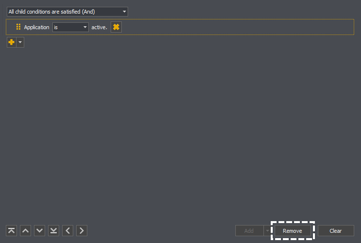 See: Overview, Editing Conditions ( Overview, Adding a Condition or Removing a Condition ) or Types of Conditions ( And, Or, Not, Application Active, Keyboard or Mouse Button )
