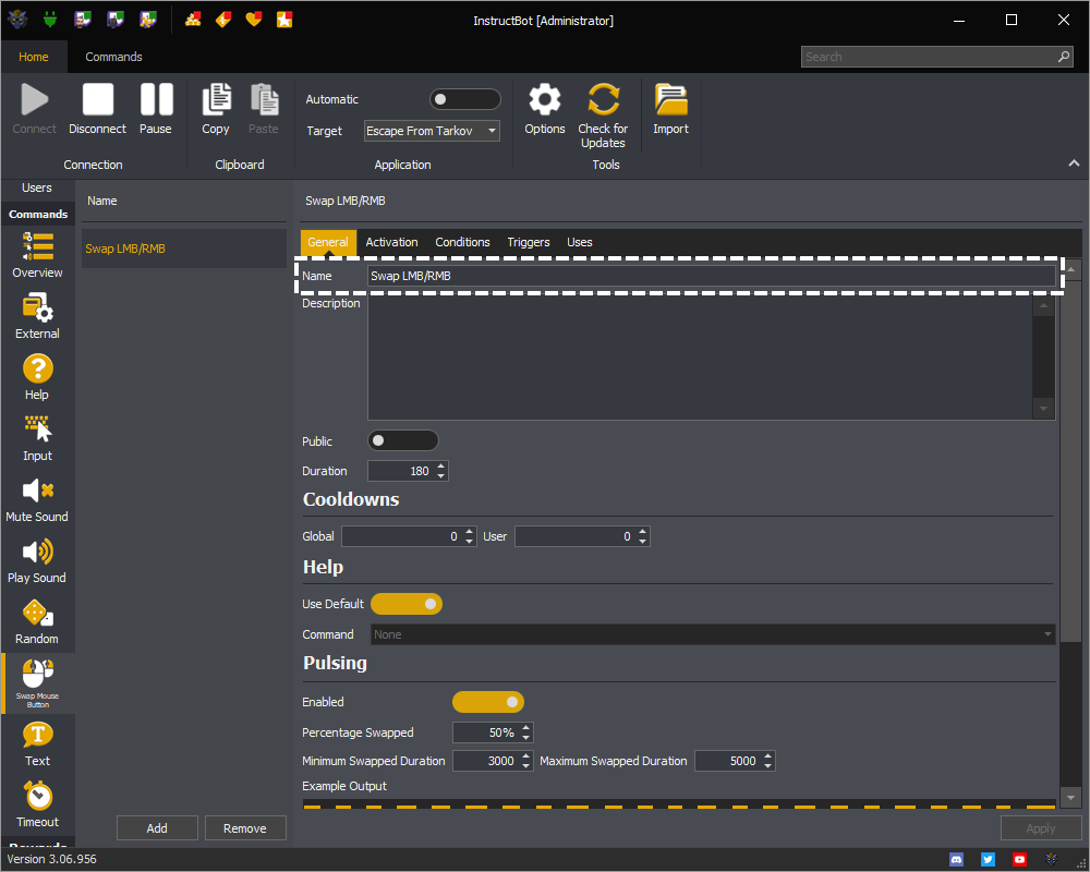 See: Name, Description, Public, Duration, Cooldowns ( Global or User ), Help ( Use Default or Command ), Pulsing ( Enabled, Percentage Swapped, Swapped Duration or Example Output ), Queue ( Use Default, Type or Name ), Sound Effects ( Start or End ) or Text ( Start or End )
