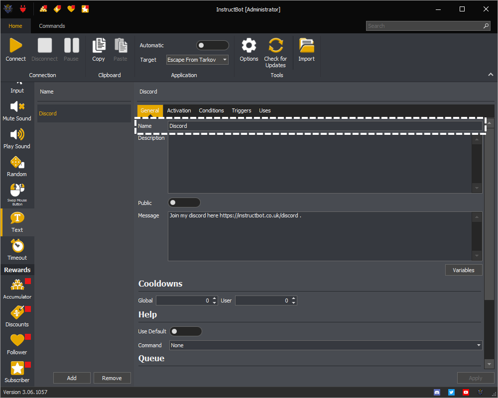 See: General ( Name, Description, Public, Message, Cooldowns, Help, Queue or Sound Effects ), Activation, Conditions ( Overview, Editing Conditions or Types of Conditions ), Triggers ( Overview, Identifier, Alias, Editing Triggers, Types of Triggers or Permissions ) or Uses ( Add, Edit, Remove or Clear )