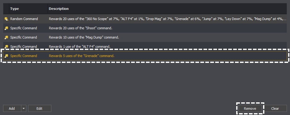 The type columns of the reward editor show an icon and name of the reward. The description column gives an overview of the settings for that particular reward.