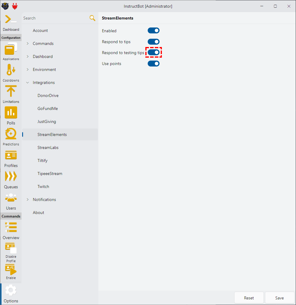 StreamElements acts as source of donations which InstructBot can respond to. To enable it navigate to the StreamElements node in the options and toggle on "Enabled".