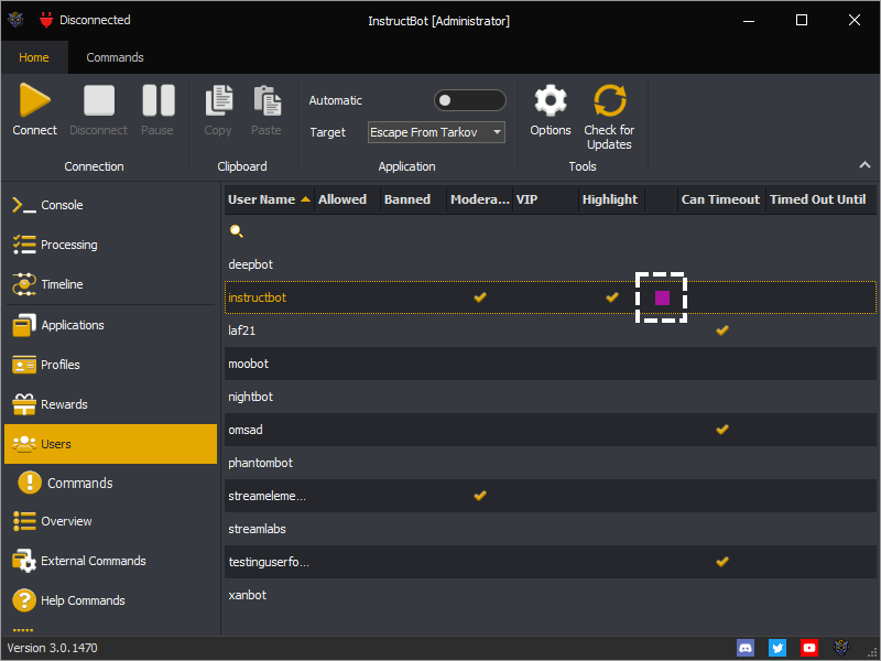 The users screen shows the list of viewers, moderators etc... known to InstructBot.